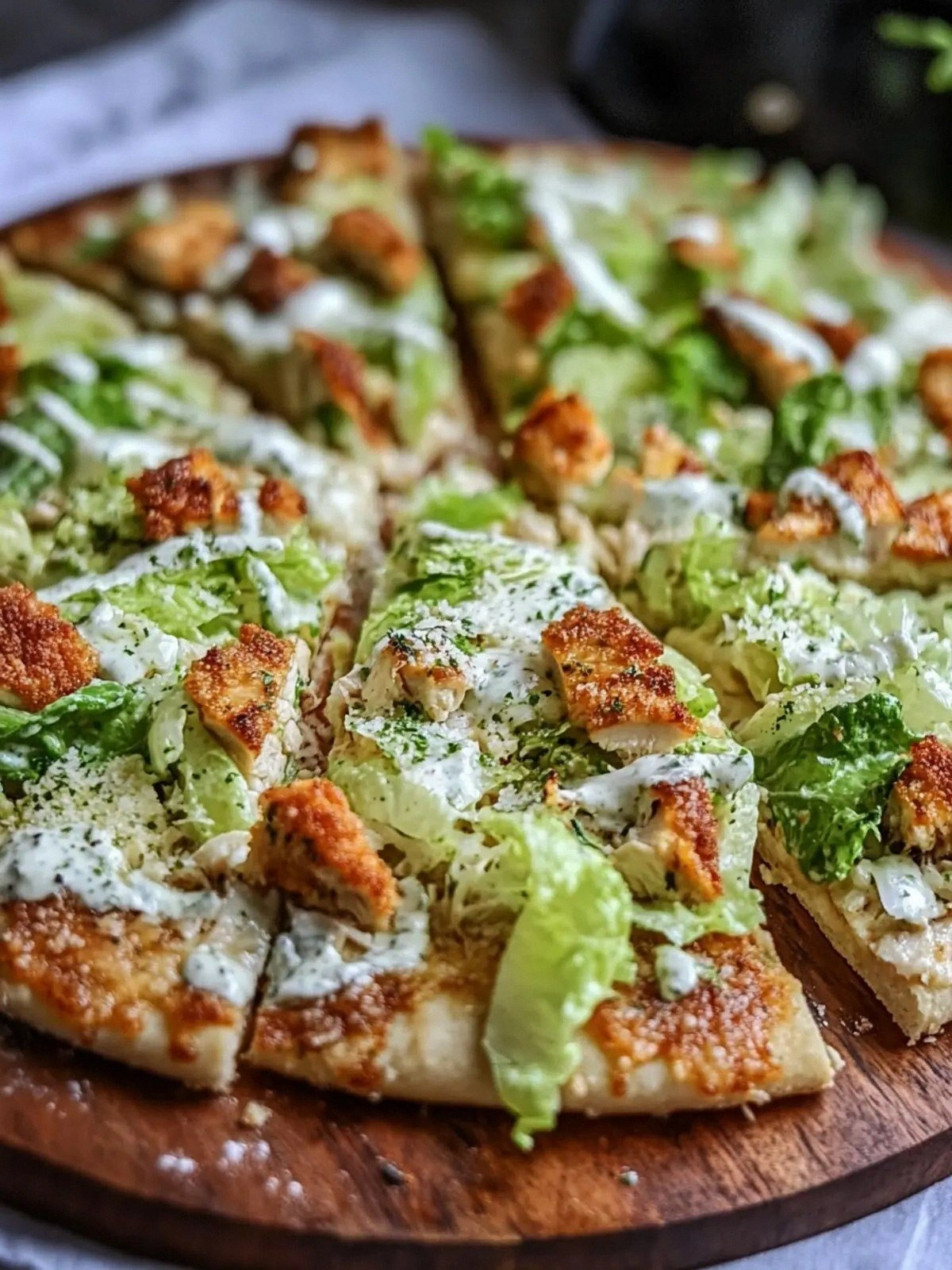 Swap the Caesar dressing for a lemon‑yogurt sauce and add chopped kalamata olives and sun‑dried tomatoes. The result is a bright, tangy flavor that pairs with the cheesy crust. Great for a summer gathering.